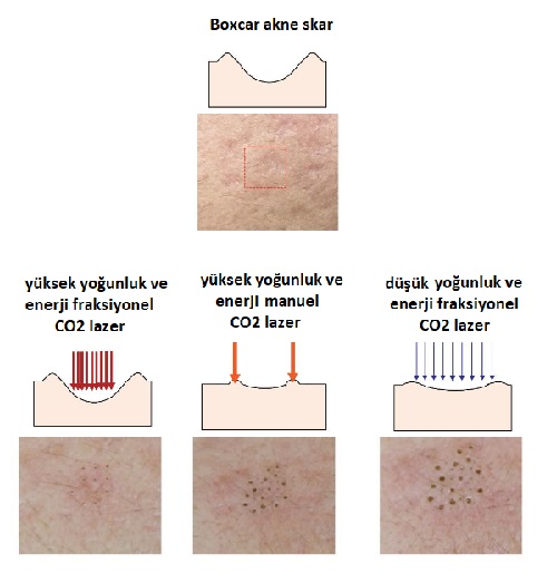 Akne sonrası gelişen rolling ve boxcar atrofik skne skalarında fraksiyonel CO2 lazerler oldukça iyi cevaplar vermektedir. Ancak özellkle akne sonrası icepick skarlar fraksiyonel CO2 lazere en az yanıtı vermektedir. Bu nedenle icepick akne skarları olan hastaların yalnızca fraksiyonel lazer yüzey yenileme monoterapisinden memnun kalma olasılığı düşüktür. Bu hastalarda mümkünse TCA CROSS tekniği veya punch eksizyonlar gibi ek tedaviler yapılmalıdır.