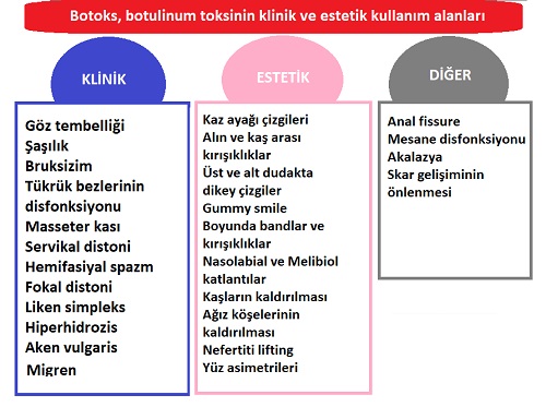 Botulinum toksini, Clostridium botulinum bakterisinden elde edilen son derece etkili bir nörotoksindir. Bu toksin, A, B, C1, C2, D, E ve G olmak üzere yedi farklı serotipe ayrılmaktadır. Klinik uygulamalarda, A serotipinin "Onabotulinumtoksin A, Abobotulinumtoksin A ve Inkobotulinumtoksin A" adlı üç formu ile B serotipinin "Rimabotulinumtoksin B" formu kullanılmaktadır. Bu dört form, sabit baş duruşuna veya anormal baş hareketlerine neden olan spazmodik tortikolisin ve migrenin tedavisinde onaylanmıştır. Ayrıca, A serotipinin üç formu, gözde şaşılık, düzensiz göz kapağı seğirmesi veya kapanması gibi durumları tedavi eden fokal distoninin yanı sıra kozmetik uygulamalarda da tercih edilmektedir. Yüz estetiği alanında, A serotipinin tüm formları, kırışıklıkların azaltılması ve yüzün dinamik ifadelerinin yumuşatılması amacıyla yaygın olarak kullanılmaktadır. Toksinin diğer tıbbi durumlarda da etkili olduğu kanıtlanmıştır; nörotoksin, faydalı bir alternatif ağrı kesici olarak değerlendirilebilir ve opioid tedavisinin yeterli sonuç vermediği durumlarda kullanılmalıdır. Son yıllarda kronik ve inatçı kaşıntı ile birlkte olan liken simplekste, pomfolikste (dishidrotik egzama), kaşları kaldırmak, aşırı terlemde(hiperhidroz) roza hastalığı ve akne vulgaris gibi.