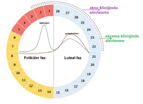 Akne vulgaris: Adet öncesi akne alevlenmeleri birçok faktöre bağlı olarak ortaya çıkar. Foliküler fazda ve yumurtlama evresinde yükselen androjenler ve östrojenler, ciltte sebum üretimini ve cilt lipitlerini artırarak mikrofloranın büyümesini teşvik eder. Sonuç olarak, adet döngüsünün ilerleyen dönemlerinde düşük progesteron seviyeleri akne alevlenmesine katkıda bulunur.