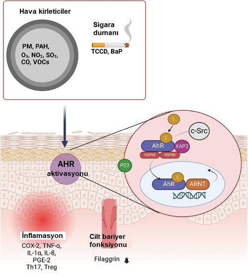 Aktive olan AhR cildin koruyucu bariyer fonksiyonunu düzenleyen genleri olumsuz etkileyerek filagrin seviyelerini düşürmektedir. Bu durum, cilt bariyerinin zayıflamasına ve cildin nem kaybına neden olurken hava kirleticilerin ciltte daha derin katmanlara geçişine yol açmaktadır. Cildin bariyer bozukluğu, atopik dermatit gibi cilt hastalıklarının klinik olarak alevlenmesine katkıda bulunur.