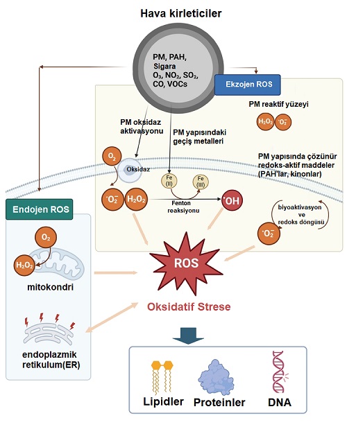 PM yapısında çözünür redoks-aktif maddeler (PAH'lar, kinonlar) biyoaktivasyon ve redoks döngüsü yoluyla ROS ve aktif elektrofilik metabolitler oluşturabilir.