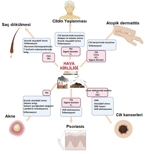Hava kirliliğinden sorumlu olan bu kirleticilerin; solunum veya kardiyovasküler hastalıklar ile artan ölüm risklerinden sorumlu olduğu net bir şekilde bilinmektedir. Belirli kirleticiler veya yardımcı kirleticiler ile maruz kalma süreleri, cildi de önemli ölçüde olumsuz etkilemektedir. Sorumlu farklı mekanizmalardan bahsedilmekle birlikte, hava kirleticilerinin reaktif oksijen türlerinin (ROS) oluşumuna neden olmaları ve bunun sonucunda ciltte ortaya çıkan oksidatif stres, asıl sorumlu olarak görülmektedir. Bunun dışında hava kirleticileri, ciltte aril hidrokarbon reseptör sinyal yolunu kullanarak çeşitli cilt rahatsızlıklarını olumsuz etkileyebilmektedir. Dahası, hava kirleticileri cilt bariyer fonksiyonunu bozabilmekte ve cildin doğal bağışıklık sistemini olumsuz etkileyebilmektedir.