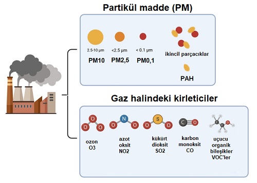 - Partikül madde (PM), metaller, organik bileşikler ve toz parçacıklarından oluşan küçük parçacıkların veya sıvı damlacıklarının bir karışımıdır. PM parçacık boyutuna göre 2.5-10 mikron olan PM10, 2.5 mikrondan küçük olan PM2,5 ve 0.1 mikrondan küçük nano PM 0.1 olarak sınıflandırılır. PM0,1 ve PM2,5 genellikle hidrokarbonları, metalleri ve atmosferik gazlar ile birlişerek ikincil parçacıkları oluşturmaktadır. PM'ler organik bileşikler, metaller veya PAH'lar dâhil olmak üzere önemli miktarda kirleticiyi taşıyabilmektedir.