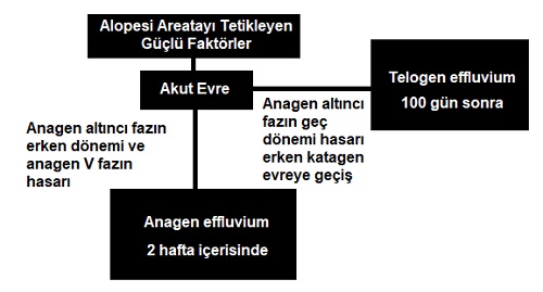 Saçlı deride foliküller; anagen, katagen, telogen, ekzogen ve kenogen saç döngüsü fazlarından geçmektedir. Anagen faz, I-VI alt fazlarına ayrılır. Altıncı fazın erken dönemi, foliküler hücre bölünmesinin (mitotik faz) en aktif olan dönemidir. Bu fazda saç foliküllerinde hem zayıf hem de güçlü hasarlar, distrofiye (saç folikül matrisinde mitozların ani bozulması), klinik olarak yama tarzı saç dökülmesine yol açar. Anagen V hasarı, fark edilmeyen küçük distrofik nonterminal saçların dökülmesine neden olarak tip VI hasarıyla birlikte yama tarzı saç dökülmesine yol açar. Altıncı fazın geç dönemi hasarı ise telogen faza geçişin hızlanmasına ve yaklaşık 100 günlük bir sürenin ardından telogen saçların yaygın dökülmesine (telogen effluvium) neden olur. Distrofik anagen saçların dökülmesi ise anagen effluvium (AE) meydana getirir. Alopesi areata, anagen effluvium nedenlerinden birisidir.