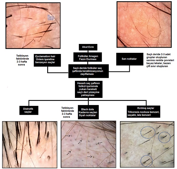Saç foliküllerinde anajen evrede keratinizasyonun durması sonrası trikoskopi bulguları ortaya çıkmakta.