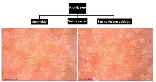 - Sarı Noktalar: Kronik alopesi areatada düzenli dağılımlı, sıklığı sayıları fazla olarak görülmektedir.