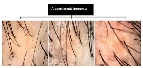 Alopesi Areata İnkogita alopesi areatanın bir alt klinik formu olarak kabul edilmekte. Yamalar tarzında değil yaygın saç dökülmesi olarak görülmektedir. Neredeyse yalnızca kadınlarda görülür ve çoğunlukla 20-40 yaş grubunda ortaya çıkar. Saç derisinden haftalar veya aylar içinde yaygın saç dökülmesi meydana gelir. Bu bulgular ile telogen effluvium gibi diğer yaygın saç dökülmesi nedenlerinden ayırıcı tanısının yapılması gerekmektedir. mak için kesinlikle gereklidir. Trikoskopi alopesi areata inkogita tansında kullanılmaktadır. Trikoskopik bulgular: