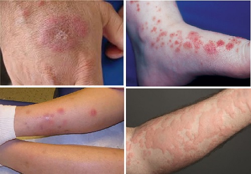 Deri Lezyonları: En karakteristik cilt bulgusu, genellikle ayak sırtında ve bacakta ortaya çıkan erizipel benzeri eritemdir (sıcak, kızarık, şiş ve ağrılı lezyon).