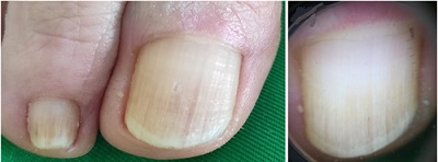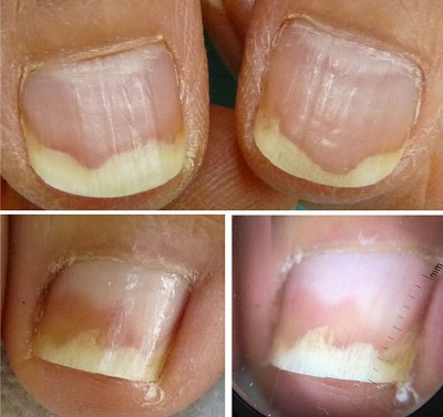 - Ayak tırnaklarında, yürüyüş anomalileri, uzun ayak tırnakları ve uygunsuz ayakkabılar, genellikle bilateral ve simetrik olan travmatik lineer transvers onikoliz ile ilişkilidir; tırnaklar beyaz veya sarımsı (tırnak kalınlaşması nedeniyle) bir renk gösterir ve dermoskopide onikolizin proksimal kenarı keskin ve çizgiseldir.