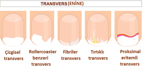 | Tırtıklı Transvers | "Diken" (Spicule) veya aurora borealis | Onikomikoz (Mantar) | Sarı-kahverengi renk, proksimale ilerleyen istila. |