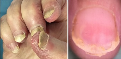 Benzer şekilde, tırnak yatağının akut püstüler psoriazisi de merkezi bölgede çok sayıda onikoliz adacığı oluşturabilmektedir.