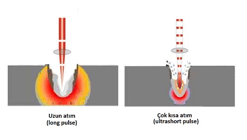 Ultra-kısa atım (Ultra-short pulse) modunun avantajı, 1 ms'nin altındaki (mümkünse 0,8 ms'den kısa) atım süresiyle birleştiğinde; uygulama alanında minimum kömürleşme ve istenmeyen termal hasar ile mükemmel bir ablasyon/koagülasyon oranı sağlamasıdır. Burada atım süresi (dwell time) hayati önem taşır. 1 ms'den uzun bir atım süresi, dokuda daha fazla kömürleşmeye ve kontrolsüz termal yayılıma neden olarak ablasyon/koagülasyon dengesini bozar; bu da daha geniş bir termal hasar bölgesine yol açar.