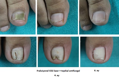 Seanslar: Protokol, 2-4 hafta aralıklarla toplam 3-4 seans olarak uygulanır. Seans aralarında günlük topikal antifungal kullanımına devam edilir.