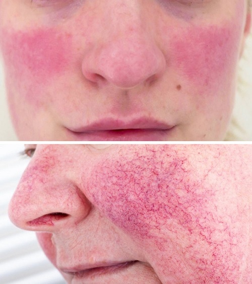 Karakteristik bir desende sabitlenmiş sentrofasiyal eritem (yüzün orta kısmında kalıcı kızarıklık), periyodik olarak yoğunlaşabilir.