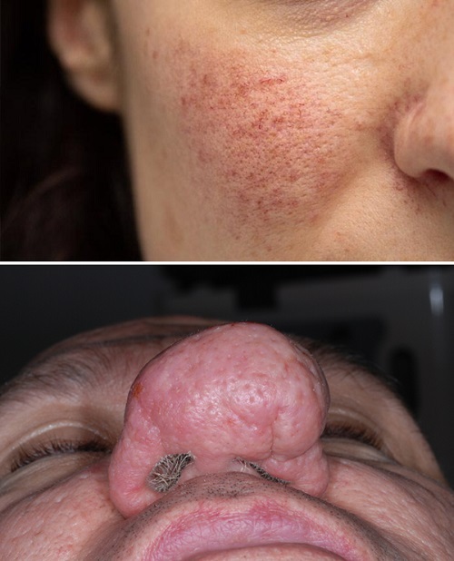 Ulusal Rozasea Derneği Uzman Komitesi'nin son tanı kılavuzlarına göre, aşağıdaki klinik tablolardan biri Rozasea için tanısal kabul edilir: