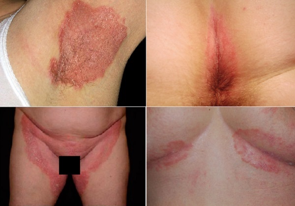 Fleksural sedef hastalığı, fazla pullanma olmadan ortaya çıkar ve aksilla, meme altı ve genital bölgeleri etkileyebilir.