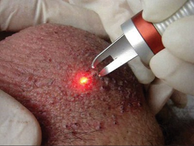 Tipik olarak, tedaviye hiperkeratotik (kalınlaşmış) cildi inceltmek amacıyla karbondioksit veya erbiyum lazerle başlanır. Ardından, damarları hedef alan potasyum titanyum fosfat (KTP) veya atımsal boya lazeri gibi bir lazer uygulanır.