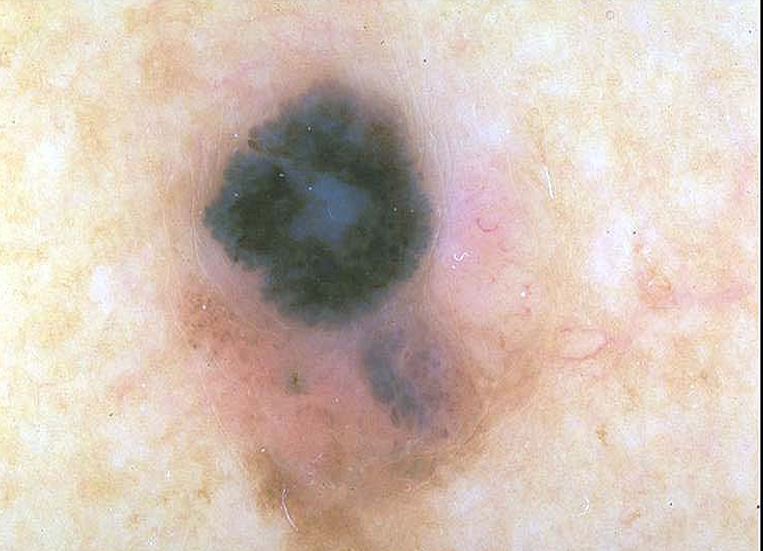 Lezyon içerisinde çok sayıda, mavi-gri renktehipopigmenta alanlar içerinde görülen noktalardır.