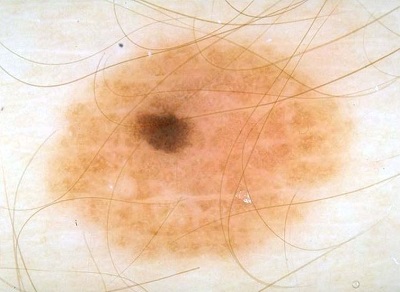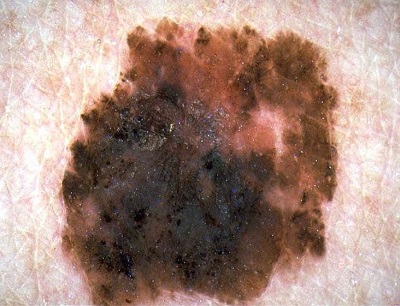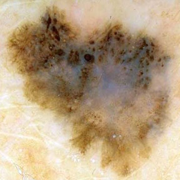 Melanositik normal nevüslerde bu lekeler lezyonun merkezinde simetrik yerleşim gösterirken maling melanomada düzensiz ve lezonun kenarlarında yerleşmektedir.