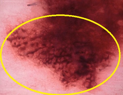 İyi sınırlı, yuvarlak-oval, kırmızı, kırmızı-mavi, kırmızı-siyah renkli yapılar olan “lakünler”in lezyon geneline hakim olmasıdır. Lakünler genişlemiş-dilate kan damarlarını ifade eder. Bunlar tromboze olduklarında siyah renkte görünürler.