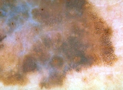 Mavi-gri noktalar ise küçük melanin içerikleri, papiller yada retiküler dermiste melanofaj varlığını göstermektedir. Bu noktalar melanoma, atipik nevüsler ve normal nevüslerde görülebilmektedir. Polarize dermoskopide daha koyu görünmeleri hatta kahverengi noktalarla karışması önemlidir.