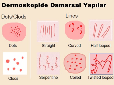 Damarsal yapılar dermoskopide fiziksel olarak noktalar/clods yada çizgiler şeklinde görülmektedir.