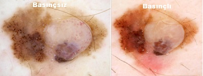 Damarsal yapıların değerlendirilmesinde dermoskop ile deri yüzeyine fazla basınç ile uygulanmaz. Fazla basınç damarsal yapıların görünmemesine neden olmaktadır.