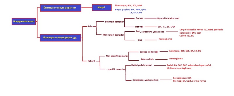 Pigmente olmayan lezyonlarda kaos ve ip uçlerı kullanılarak yapılan tanısal algoritma aşağıdaki gibidir.