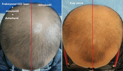 Bu protokol sonrası tedavi edilen alanlarda hafif eritem, kaşıntı, kuruluk, deskuamasyon (kepeklenme) ve geçici saç dökülmesi (shedding) görülebilmektedir. Fraksiyonel CO2 lazer ve takiben topikal minoksidil/dutasterid kullanımı; tedavi öncesine kıyasla saç çapında ve terminal saç sayısında anlamlı bir artış sağlarken, AGA tablosunda belirgin bir görsel düzelme oluşturmaktadır. Bu kombinasyonun sinerjik etkisi, özellikle genç yaşta ve kısa süreli dökülme geçmişi olan hastalarda, foliküler kök hücre rezervinin korunmuş olması ve perifoliküler fibrozisin henüz yerleşmemiş olması nedeniyle daha başarılı sonuçlar vermektedir.