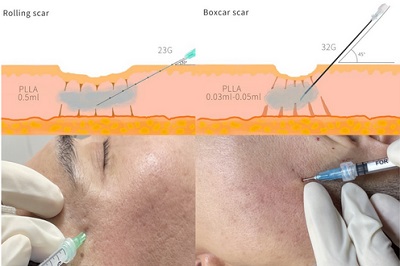 Atrofik akne izleri arasında icepick (buz kıracağı) skarlar, dar ve derin yapılarıyla karakterizedir. Bu homojen ancak dikey derinliği fazla olan izlerde, gerek fraksiyonel CO2 lazer gerekse dolgu uygulamalarından alınan klinik yanıtlar genellikle beklentinin altında kalmaktadır. İcepick skarlar dolgu ve lazere dirençlidir. Bu izlerde "altın standart" olarak kabul edilen TCA CROSS (Chemical Reconstruction of Skin Scars) yöntemiyle, yüksek konsantrasyonlu trikloroasetik asit doğrudan skar tabanına uygulanarak tabanın yükseltilmesi sağlanmalıdır. Taban yükseldikten sonra lazer tedavisi çok daha etkili olacaktır.Buna karşın, boxcar (kutu) tipi izler daha geniş bir skar tabanına sahiptir. Bu yapı, dolgu materyalinin skar tabanına homojen şekilde dağılmasını kolaylaştırarak daha yüksek bir klinik başarı elde edilmesini sağlar. Geniş tabanlı boxcar skarlarda, skar tabanına PLLA ile biyostimülasyon yaparken, eş zamanlı olarak yüzeyel tabakaya düşük viskoziteli bir hiyalüronik asit uygulamak (Sandviç Tekniği), hem anında görsel düzelme sağlar hem de uzun vadeli kolajen üretimini destekler. Rolling (dalgalı) skarlar ise diğer tiplere oranla daha geniştir ve genellikle normal bir epidermis yapısına sahiptir; bu durum, dolgu uygulamalarından en yüksek klinik verimin bu izlerde alınmasını sağlar. Akne izleri tedavisinde subsisyon yöntemi oldukça etkili olduğundan, dolgu uygulamalarının subsisyon eşliğinde yapılması tedavi etkinliğini belirgin ölçüde artırmaktadır. Rolling skarlarda dolgu öncesi yapılan subsisyon sadece yer açmakla kalmaz, aynı zamanda dokuda bir "kontrollü travma" yaratarak büyüme faktörlerini aktive eder. Subsisyon ile serbestleşen boşluğa PLLA verilmesi, kolajen sentezini tetikleyen biyostimülan etkiyi tam da ihtiyacın olduğu fibrotik bant bölgesinde yoğunlaştırır.