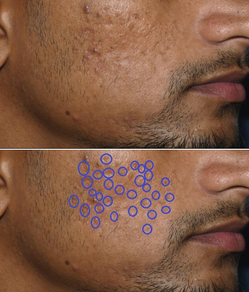 Mevcut akne skarlarının klinik muayenesi ile skar klinik formaları ve klinik şiddetleri saptanarak cilt üzerinde boxcar skarların işaretlemeleri yapılmaktar. Kombine tedavinin yapılacağı alanın aseptik koşulları sağlanarak lokal anestezi uygulanır.