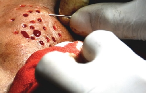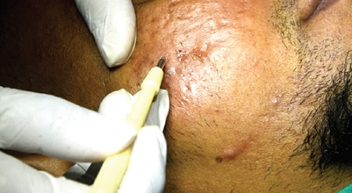 Punch deliklerinden (hollerinden) 18G iğne ya da Nokor iğneleri ile girilerek, tüm skar alanında skarlara(rolling skarlar gibi) subsizyon uygulanır.
