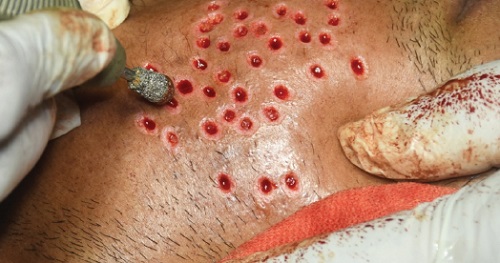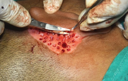 Punchlar ile (akne skar alnında kullanılan çapların 0,5 mm daha büyük çaplı olanları ile) deri altı yağ dokusuna kadar inilerek dermal greftler kesilerek alınmakta ve steril serum fizyolojikli gazlı bez içerisinde saklanmakta. Donor alan antibiyotikli krem içeren gazlı bezler ile örtülerek sekonder iyileşmeye bırakılmakta(7-10 gün kapalı pansuman).