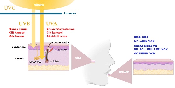 Dudaklar, diğer vücut bölgelerine göre daha ince bir deriye sahip olması, yağ bezlerinin yokluğu ve sınırlı melanin içeriği gibi anatomik özellikleri nedeniyle ultraviyole (UV) radyasyon gibi dış faktörlere karşı özellikle hassastır, bu da özel bir bakım ve fotokoruma gerektirmektedir. Yüz ve vücut için güneş kremleri bol ürün çeşitliliği ile yaygın olarak kullanılmasına rağmen, dudaklara özgü güneş koruma ürünlerinin yetersizliği ve daha az kullanım alışkanlığı bulunmaktadır. Ancak dudak kanseri için bir risk faktörü olarak UV konusunda farkındalığın artırılması ve dudak fotokoruyucuların düzenli kullanımı gerekmektedir.