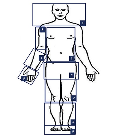 Klinik görünüm için hastanın vücudu 9 bölüme ayrılmaktadır. Cilt lezyonları tüm vücuda yayılmışsa veya gövde, sırt, yüz veya saçlı deriyi tutan yaygın bir döküntü varsa "yaygın uyuz" olarak kabul edilmektedir. Bu 9 bölümde birden fazla kabuklu (hiperkeratotik) lezyon var ise "kabuklu uyuz" tanısı konulmaktadır.