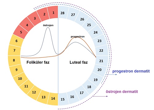Akne vulgaris: Adet öncesi akne alevlenmeleri birçok faktöre bağlı olarak ortaya çıkar. Foliküler fazda ve yumurtlama evresinde yükselen androjenler ve östrojenler, ciltte sebum üretimini ve cilt lipitlerini artırarak mikrofloranın büyümesini teşvik eder. Sonuç olarak, adet döngüsünün ilerleyen dönemlerinde düşük progesteron seviyeleri akne alevlenmesine katkıda bulunur.
