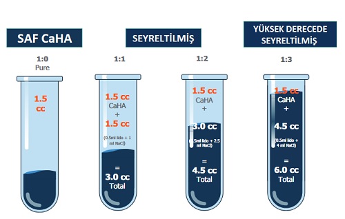 - Saf CaHA: 1,5 ml CaHA + 0,5 ml lidokain seyreltilir.