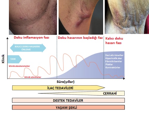 Cerrahi girişimler, 'nin Hurley klinik sınıflamasına göre seçilmekte olup, hastalığın evresine göre farklı yaklaşımlar uygulanır.