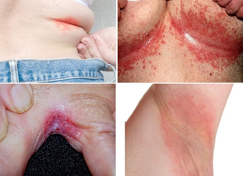 Bu alanlarda kaşıntı, ağrı,koku ve yanma şikayeti olan hastaların kliniğinde kızarıklık ile birlikte, deride yüzeysel doku kaybı-erozyon, çatlaklar ve akıntı görülebilir.